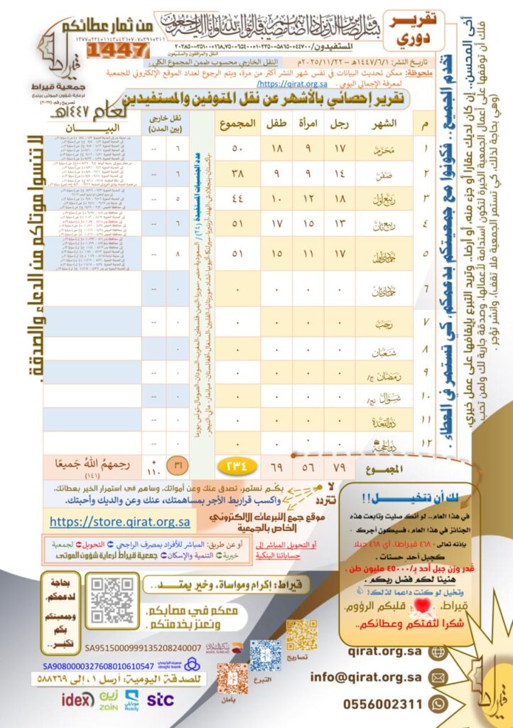 أصدرت الجمعية تقريرها الدوري لشهر (جمادى الأولى) لعام 1447هـ، حيث بلغ عدد الوفيات (51) حالة، ومجموع سنوي (234)، ومجموع كلي (1377)، ومجموع كلي للنقل الخارجي بين المدن (141)، غفر الله لهم، وأنزل على قبورهم شآبيب الرحمات، وجبر مصاب أهليهم وذويهم .