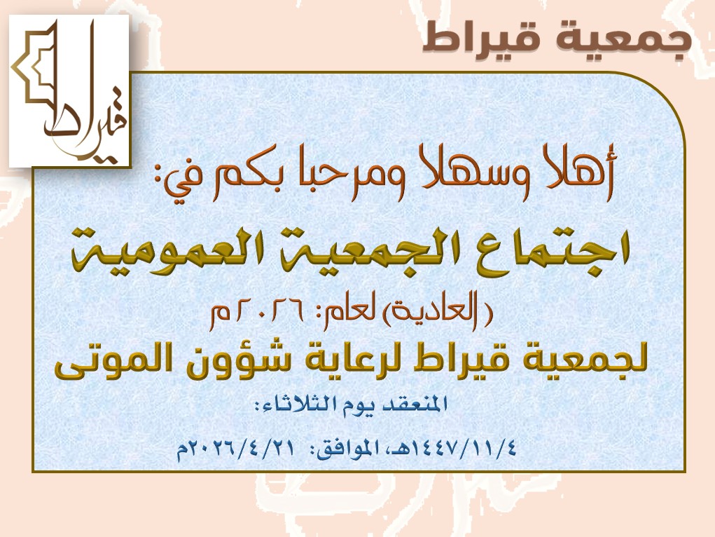 أصدرت جمعية قيراط تقريرها الدوري لشهر (شوال) لعام 1447هـ، حيث بلغ عدد الوفيات (43) حالة، ومجموع سنوي (472)، ومجموع كلي (1615)، ومجموع كلي للنقل الخارجي بين المدن (169)، غفر الله لهم، وأنزل على قبورهم شآبيب رحماته، وجبر مصاب أهليهم وذويهم .