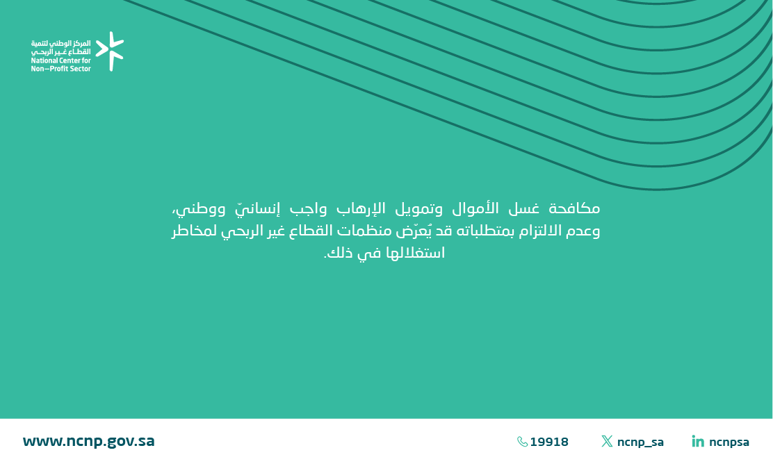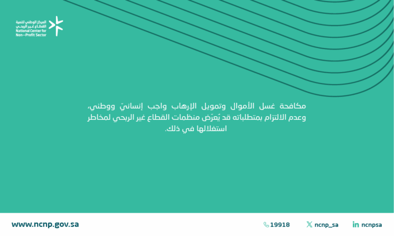 يسرنا أن نُشارككم هذه الرسالة التوعوية، والتي تأتي في إطار سعي المركز الوطني لتنمية القطاع غير الربحي لرفع وتعزيز مستوى وعي منسوبي المنظمات غير الربحية بالمواضيع والمستجدات المرتبطة بمكافحة غسل الأموال وتمويل الإرهاب، بهدف حماية القطاع غير الربحي من سوء الاستغلال بما يُساهم في زيادة ثقة مجتمع المانحين في سلامة ونزاهة القطاع غير الربحي .